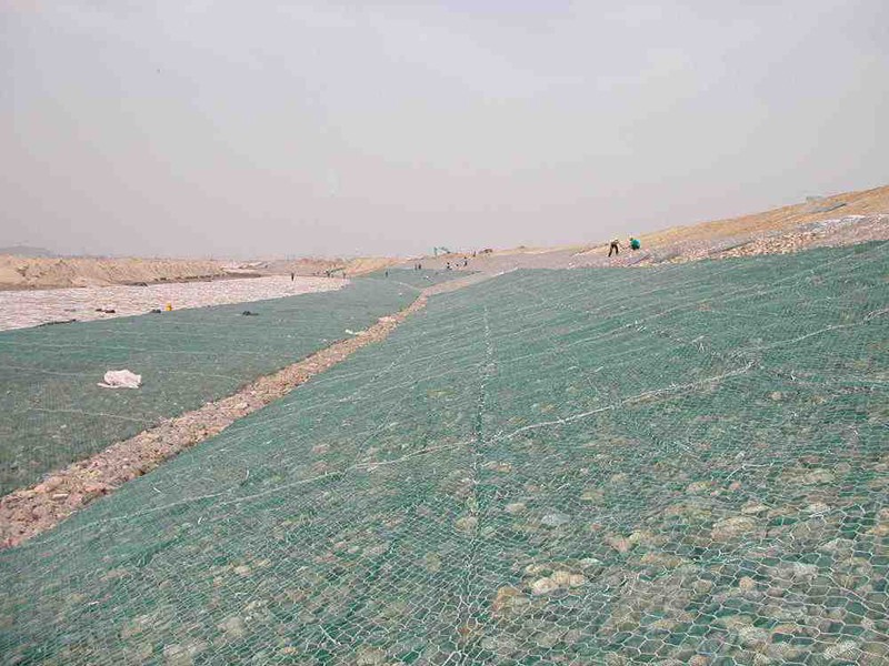 雷諾護(hù)墊是厚度在0.17-0.3m的網(wǎng)箱結(jié)構(gòu),在現(xiàn)場(chǎng)用于裝填石頭。主要用作河道、岸坡、路基邊坡護(hù)坡結(jié)構(gòu)。既可防止河岸遭水流、風(fēng)浪侵襲而破壞,又實(shí)現(xiàn)了水體與坡下土體間的自然對(duì)流交換功能,達(dá)到生態(tài)平衡。坡上植綠可增添景觀、綠化效果。